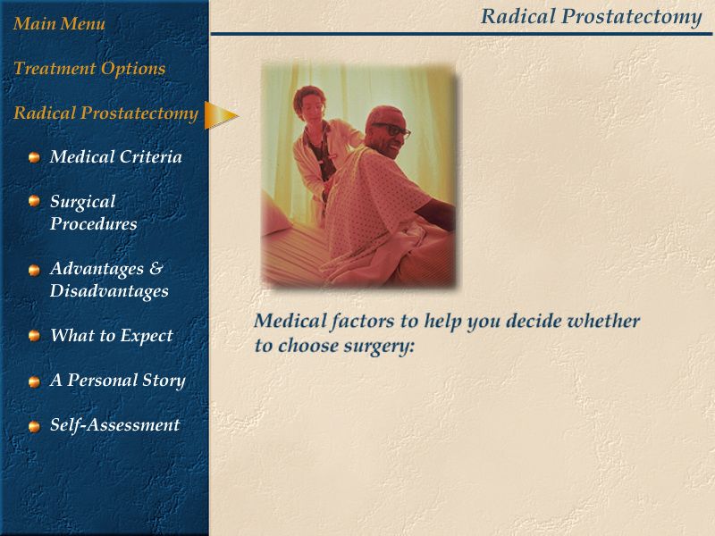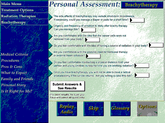 The program opens with narration by "Joe," a prostate cancer survivor. Joe captures the user's attention with a brief description of his experience in learning about prostate cancer and the importance of taking the time to explore treatment options. Leading a "cast" of other patients and several medical providers, Joe serves as the narrator throughout the product, introducing topics, providing navigation cues, and offering plain-language explanations of medical information. The prototype decision-making aid prompts users to enter relevant information about their own medical situation and personal preferences, and provides an assessment of brachytherapy as a treatment option under those conditions.