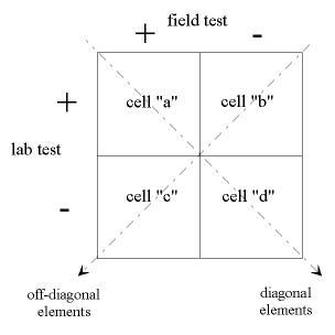 The kappa statistic, in contrast, is a measure of agreement. Kappa computations focus on the data in the major diagonal from upper left to lower right, examining whether counts along this diagonal differ significantly from those expected by chance (Streiner, Norman, and Blum, 1989). If there were no agreement between the responses on the two tests then we would expect an identical proportion of individuals to score high versus score low on the field test for individuals who scored high on the lab test.